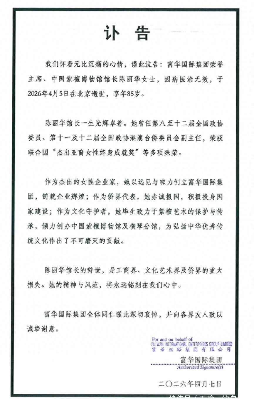 目前,陈丽华创办的富华国际集团已经发布讣告。