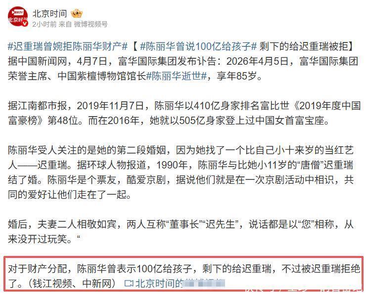 多年前,陈丽华就表示除了给子女100亿,其他的钱全留给迟重瑞,但迟重瑞拒绝了。